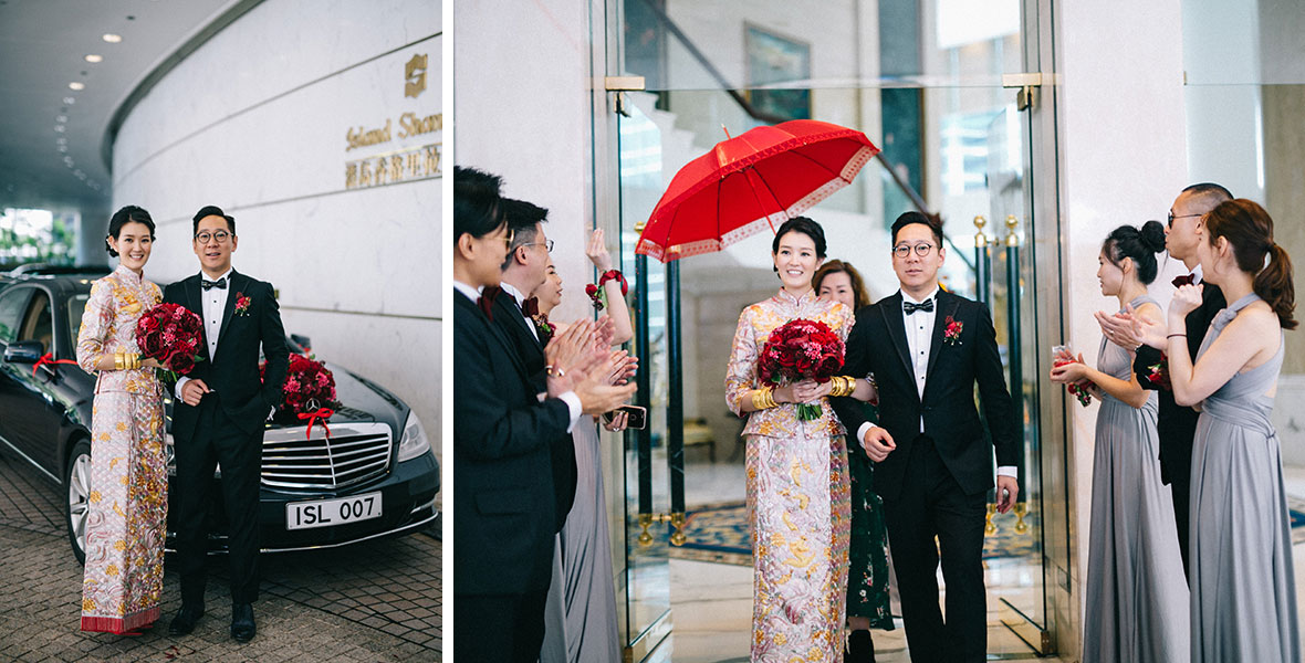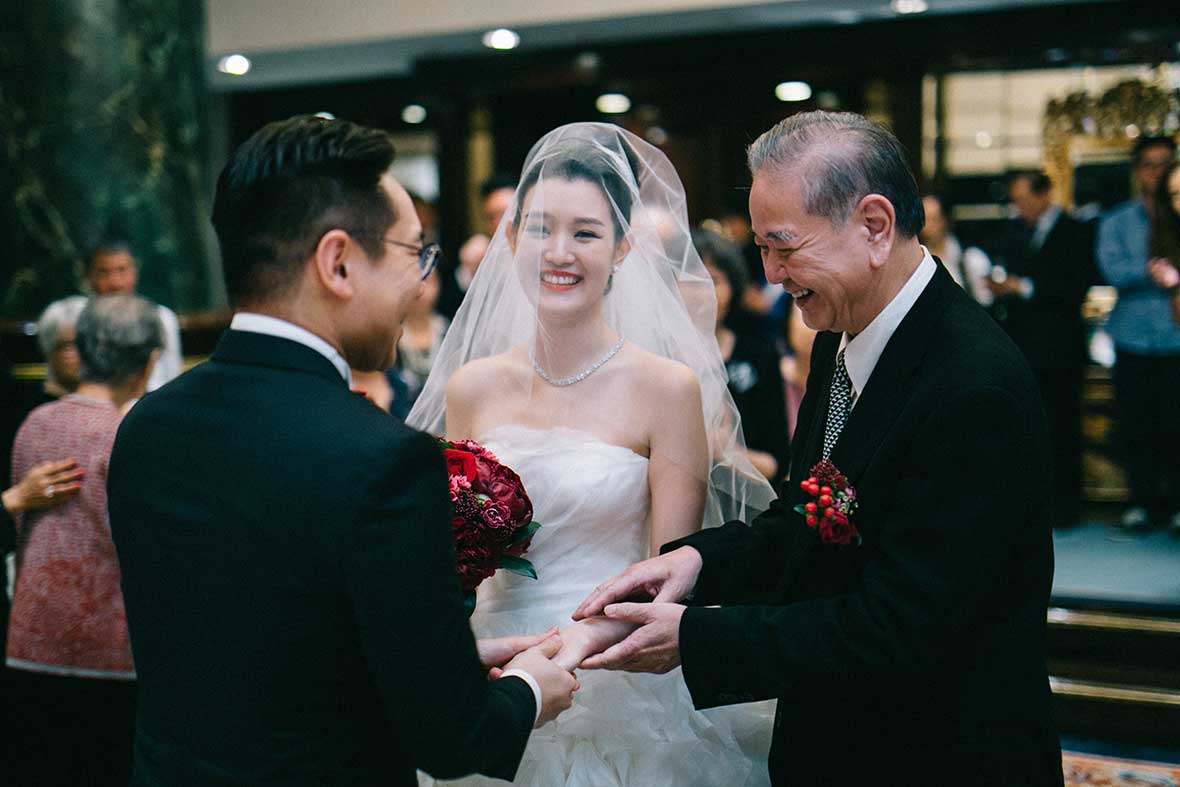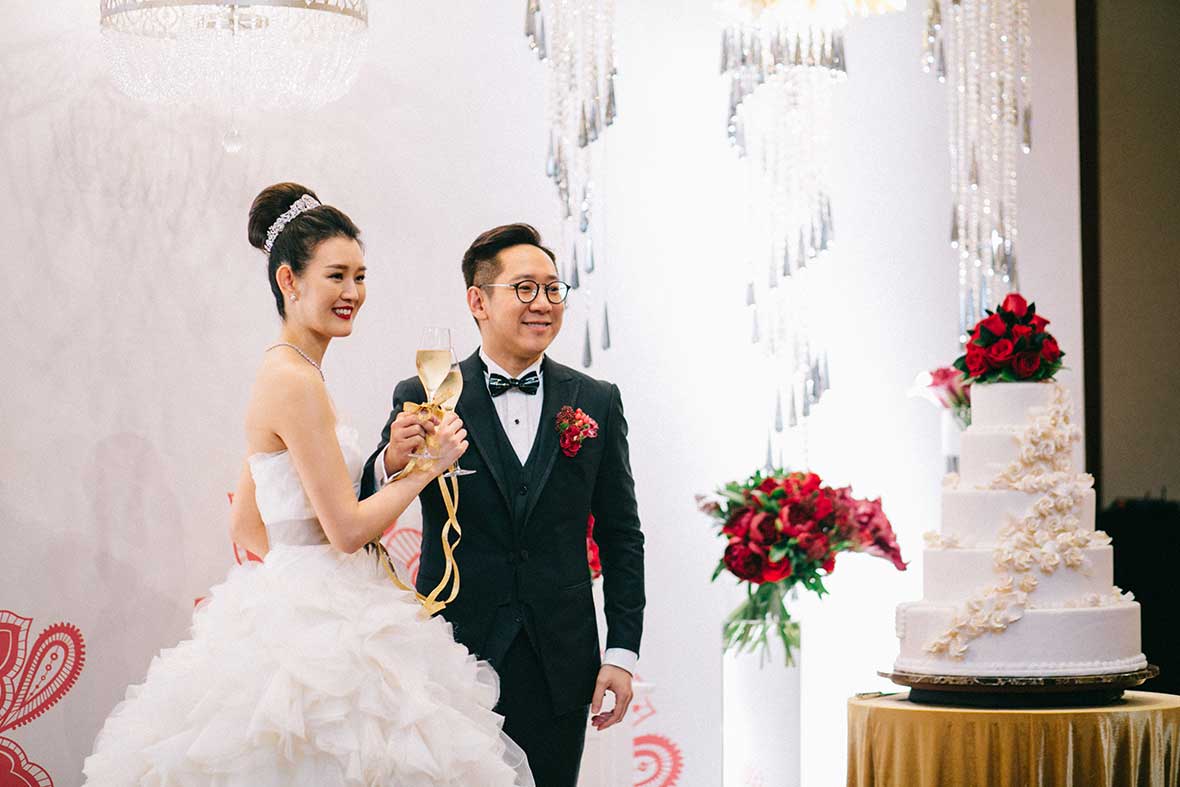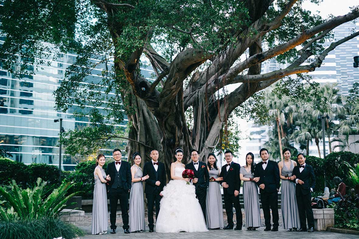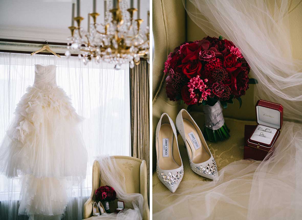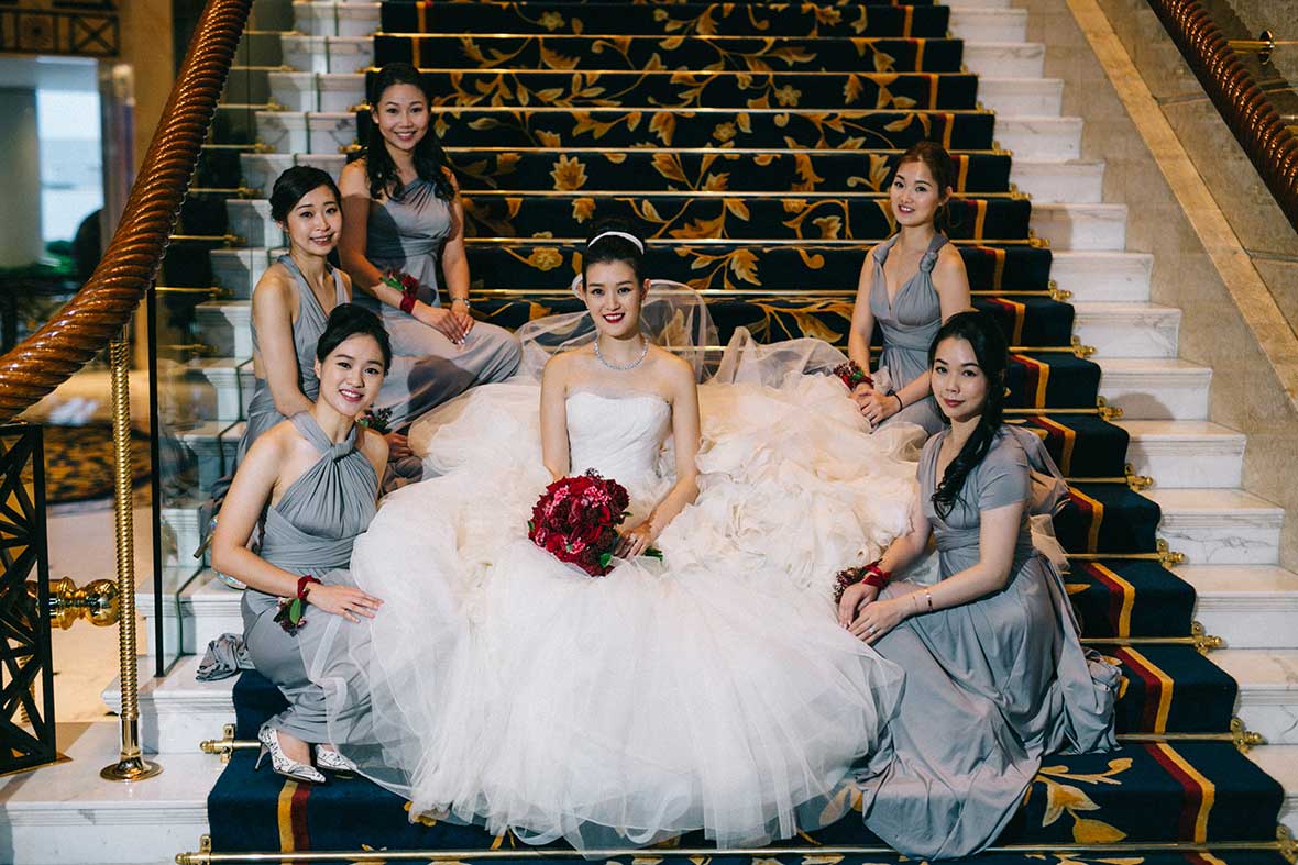 Photographer and Videographer: Patrick Photography / Ceremony and Reception Venue: Island Shangri La, Hong Kong / Bride’s Dress: Vera Wang from Central Weddings (main gown), Jenny Packham (second dress and red gown), Koon Nam Wah (Chinese traditional dress) / Bridesmaid Dresses: Rania Hatoum / Groom’s Attire: Tuxee / Makeup Artist: Angus Lee / Bouquets and Flowers: Liana Floral Couture / Decorations: Only Mine / Accessories: Lane’s Bridal