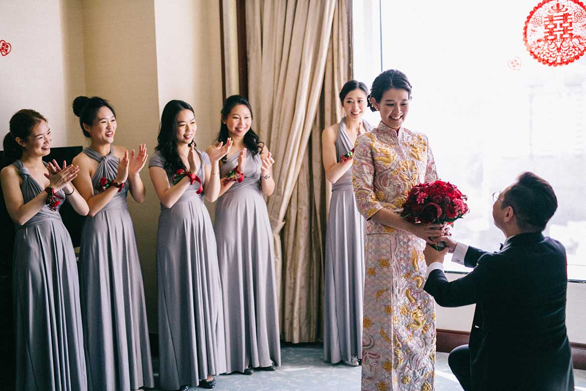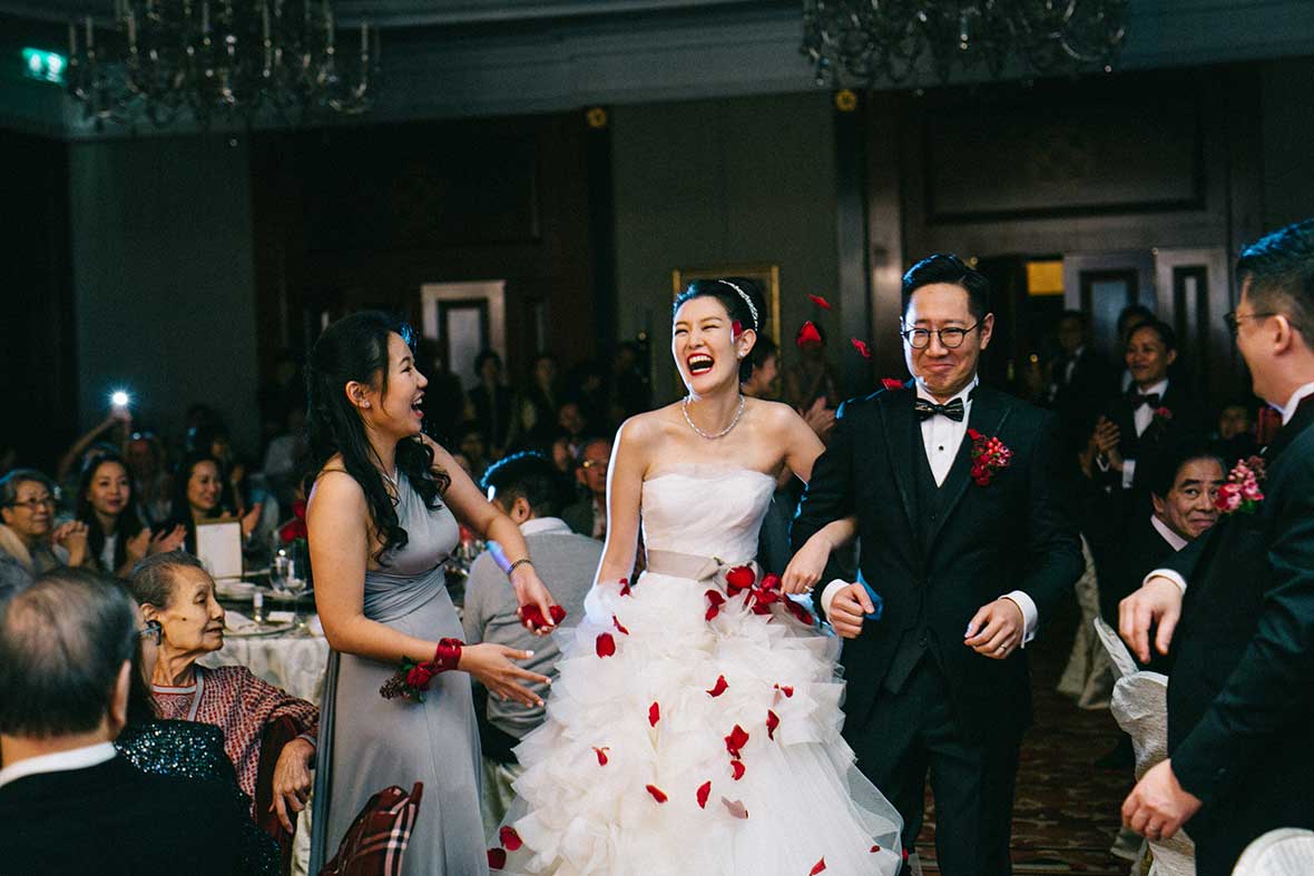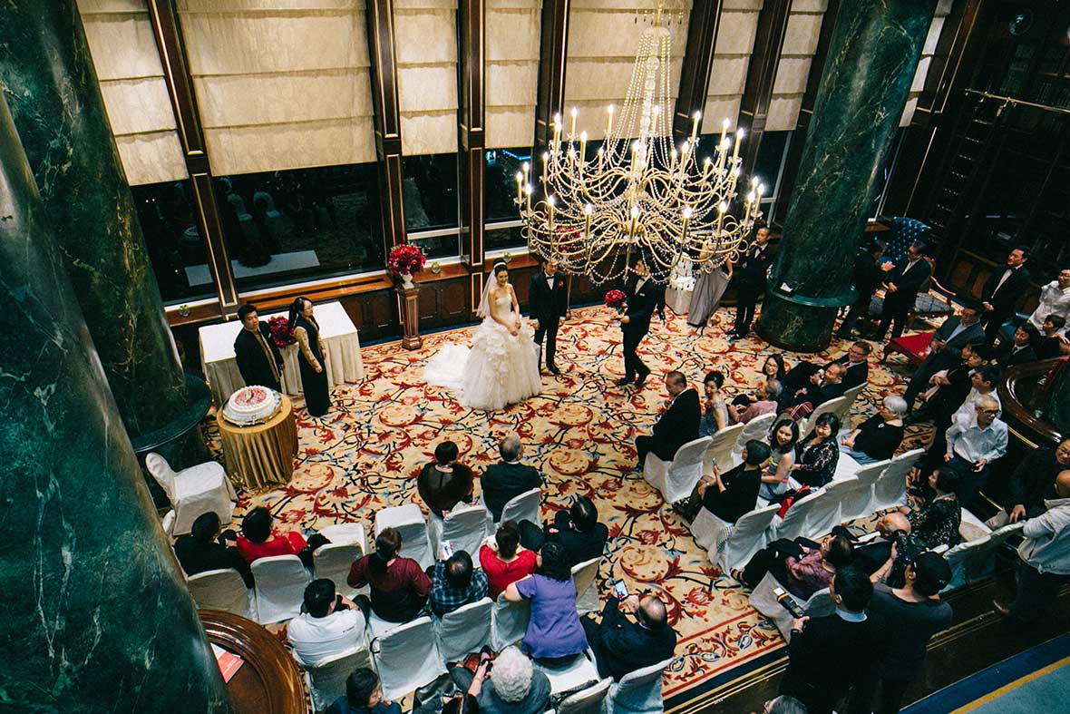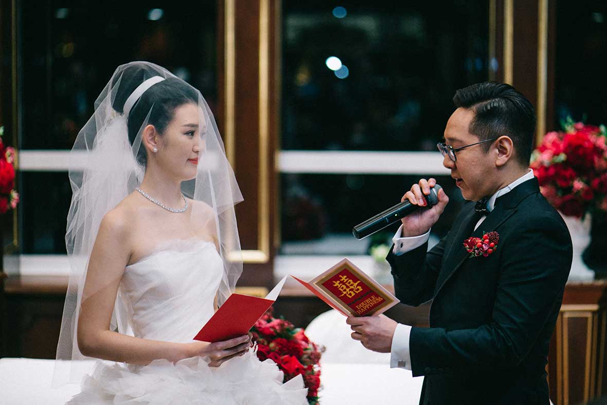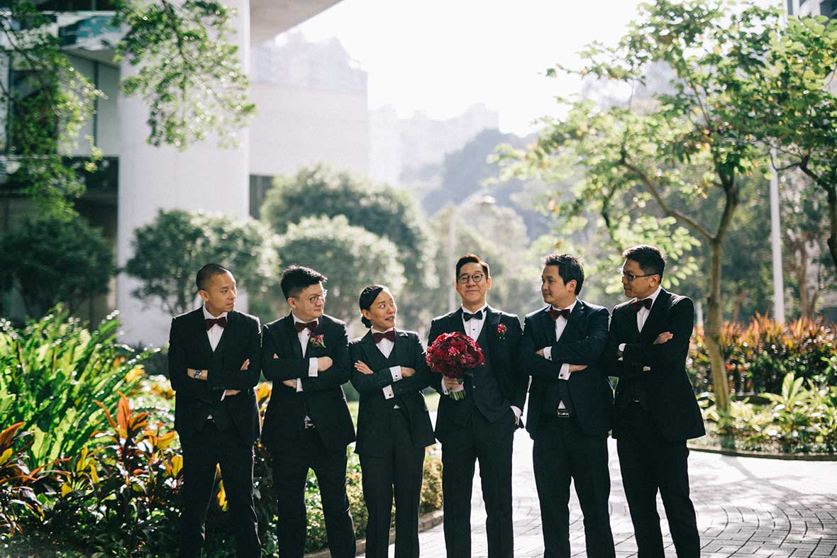 Photographer and Videographer: Patrick Photography / Ceremony and Reception Venue: Island Shangri La, Hong Kong / Bride’s Dress: Vera Wang from Central Weddings (main gown), Jenny Packham (second dress and red gown), Koon Nam Wah (Chinese traditional dress) / Bridesmaid Dresses: Rania Hatoum / Groom’s Attire: Tuxee / Makeup Artist: Angus Lee / Bouquets and Flowers: Liana Floral Couture / Decorations: Only Mine / Accessories: Lane’s Bridal