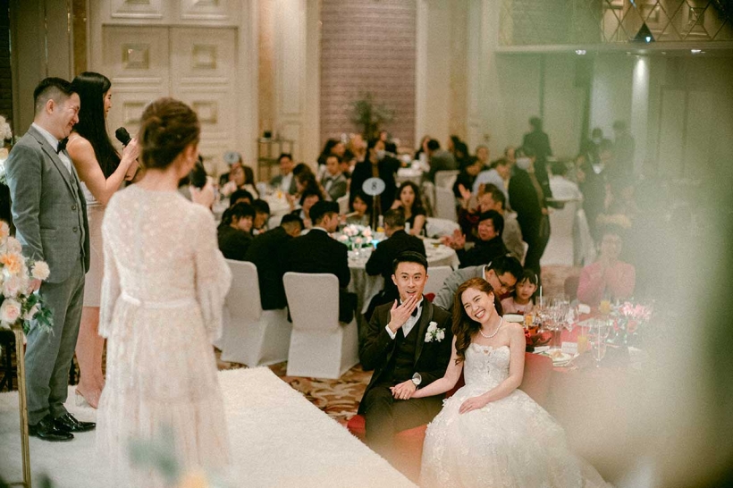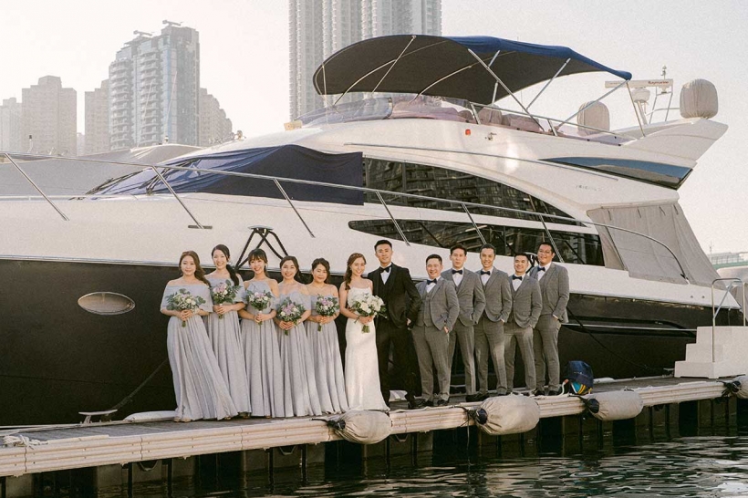 At Aberdeen Marina Club 深灣遊艇會, the sun gave its warm, golden-hour glow as the couple walked along the docks before the banquet started. The flares of sunlight captured in the photos show the kind of magic that can be felt in the first few moments of becoming newlyweds. It also reflected the joy felt by the bridesmaids and groomsmen who were glad to be there to celebrate their friends’ beautiful wedding day. The day ended with great food, drinks, smiles and laughter – all to mark the beginning of a fruitful marriage.