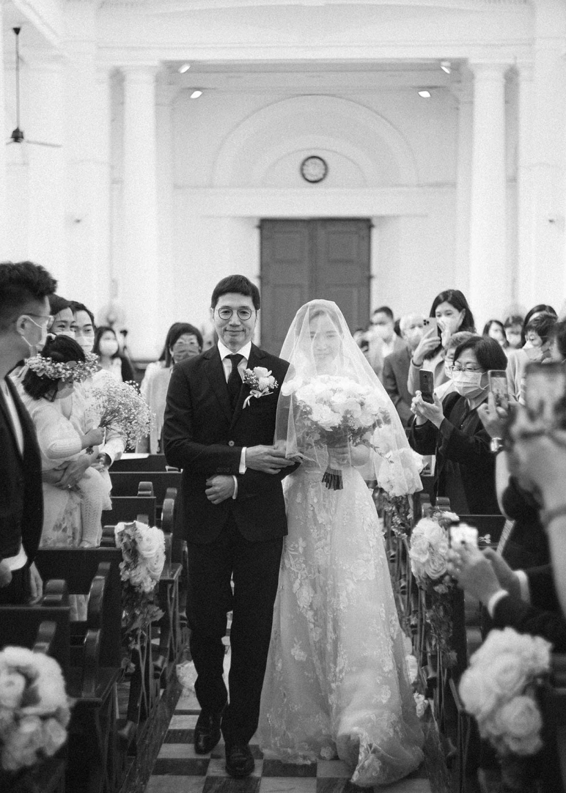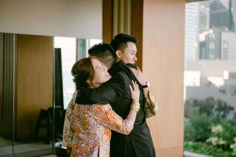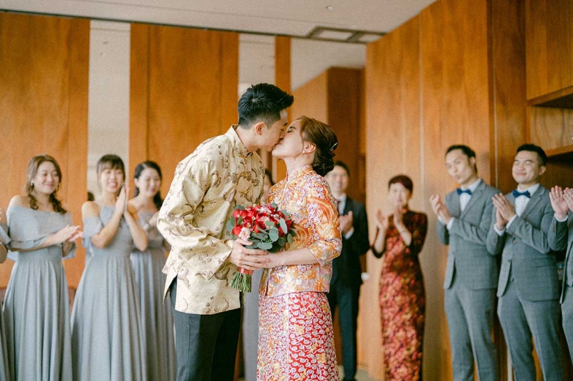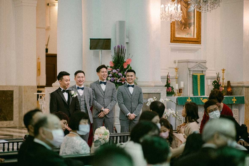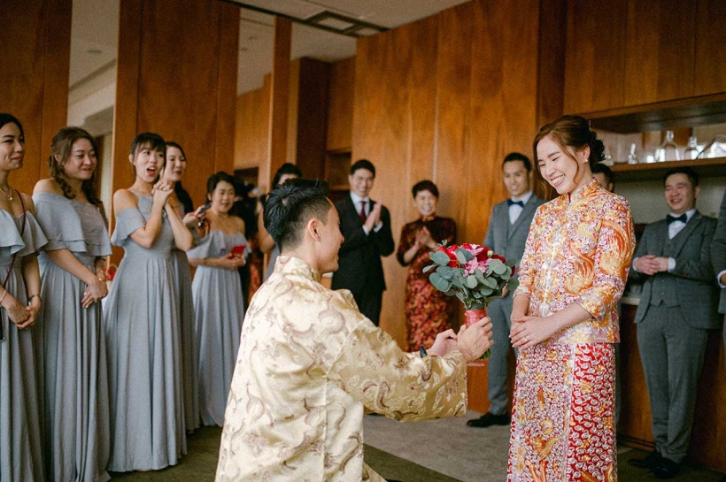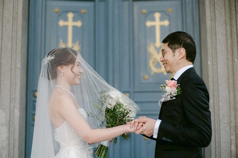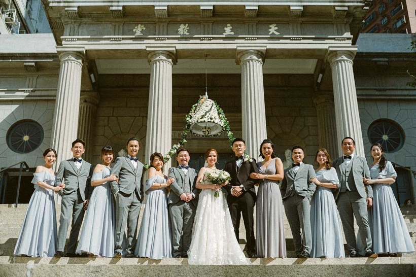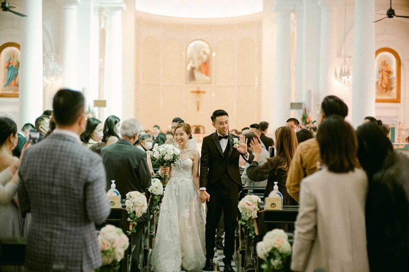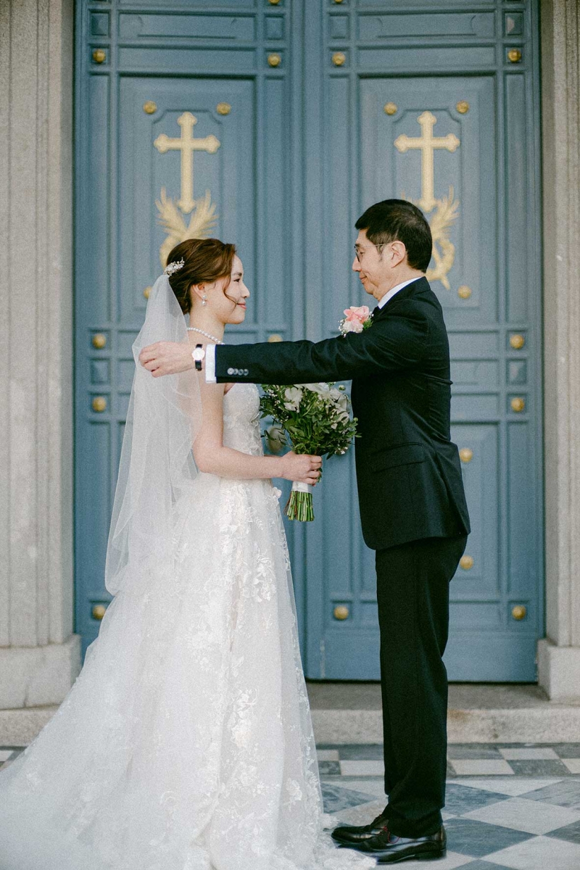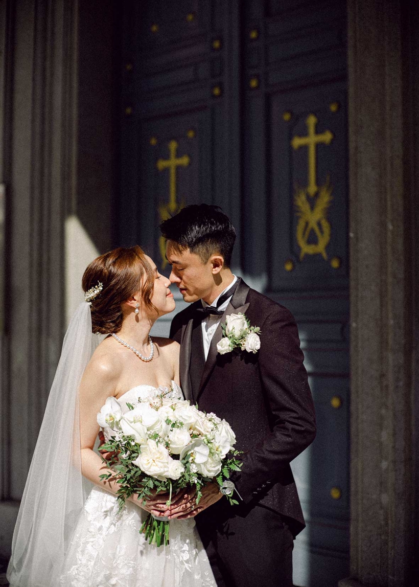For Jay and Michelle, they started their wedding day getting ready for their tea ceremony at the luxury hotel, Grand Hyatt, in Hong Kong. With a bouquet of flowers in her hand, Michelle wore a qun kua with gold and white detailing sewn onto bright red fabric; on her neck hung a row of golden bangles to signal the bride being welcomed into the family. Afterwards, the couple decided to go for a walk under the archway of trees at the outside area of the hotel, which was a wonderful spot for some photos. Hand in hand, Jay and Michelle enjoyed the soft midday light in each other’s loving company before heading to St. Margaret’s Church for the wedding ceremony.