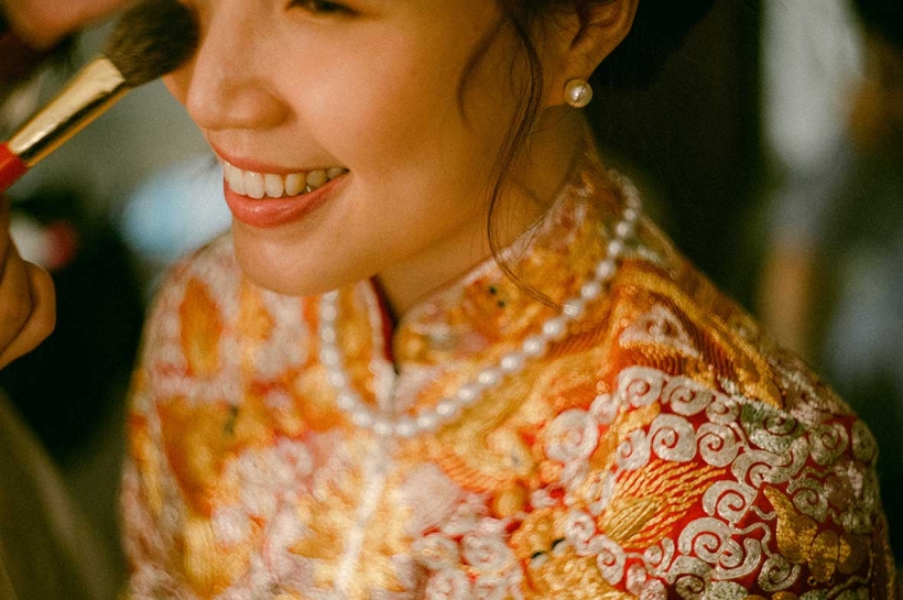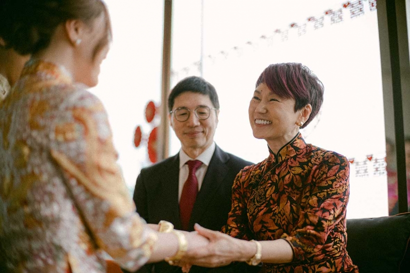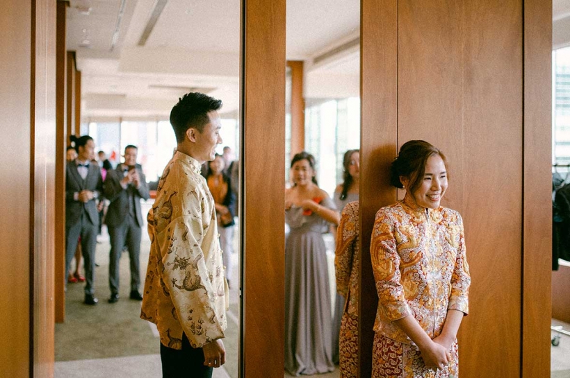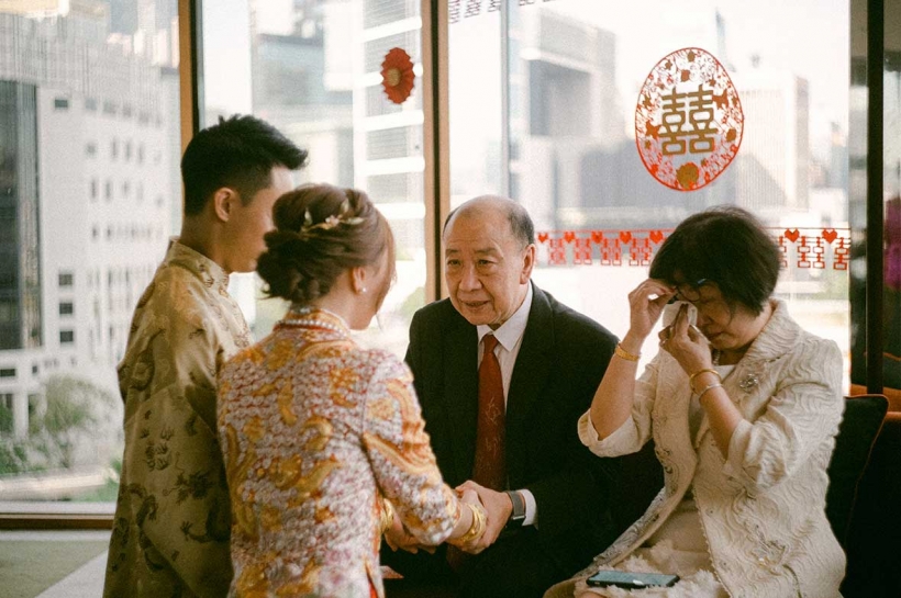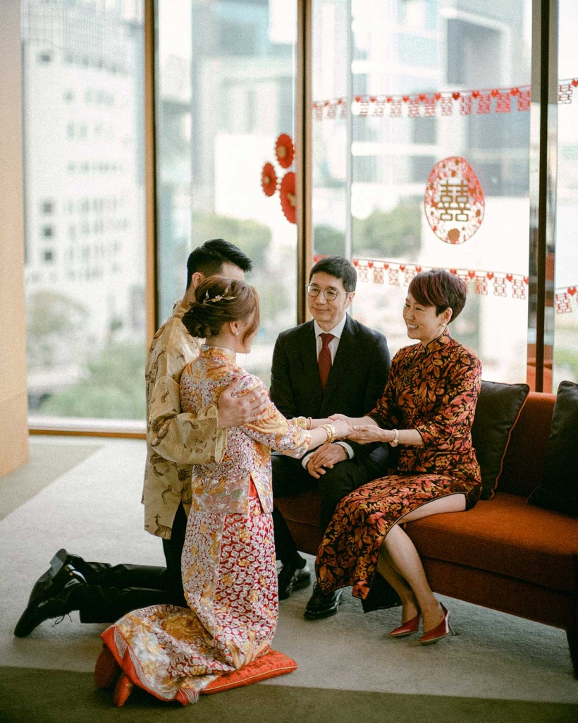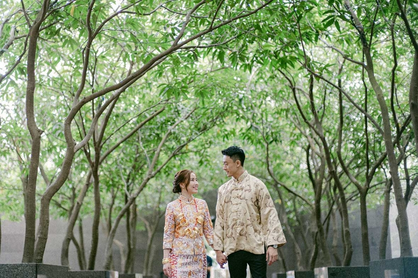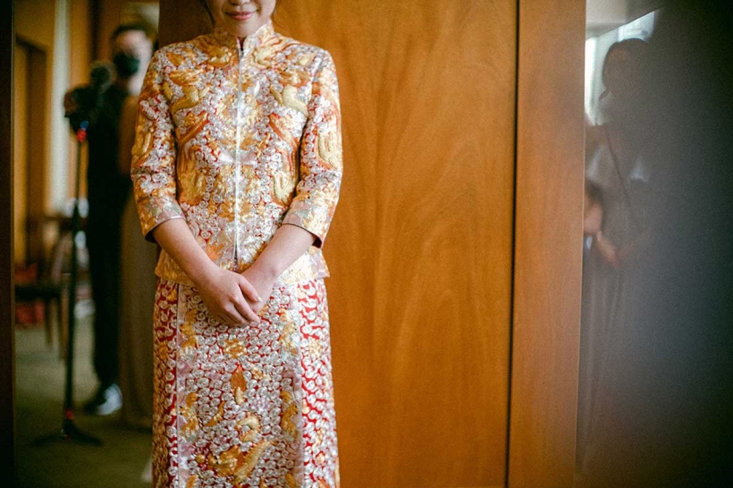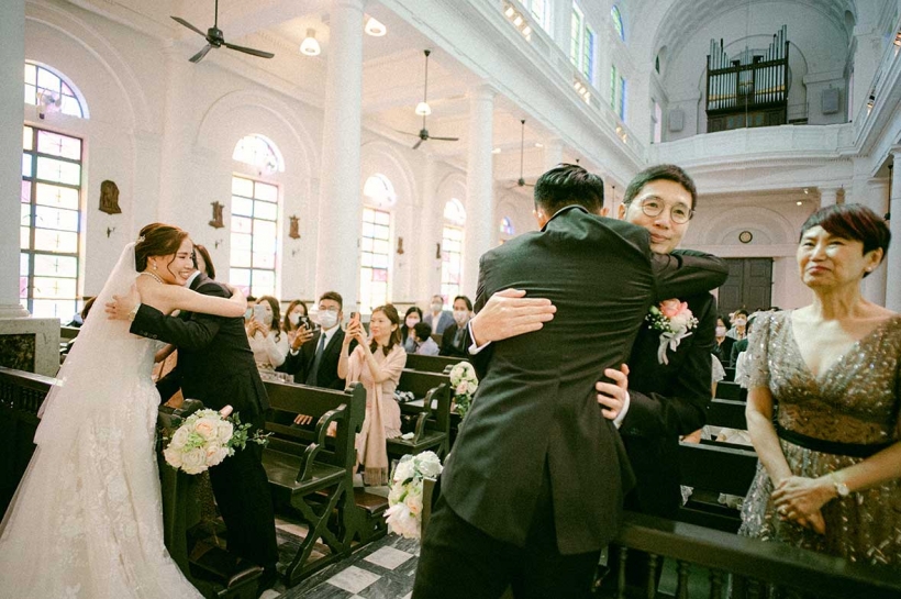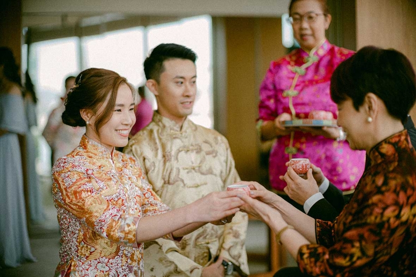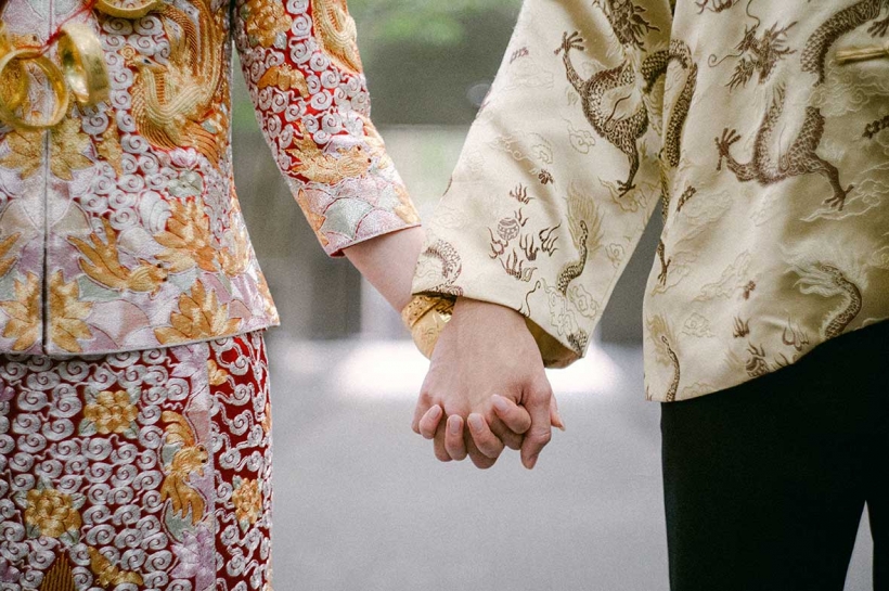 For Jay and Michelle, they started their wedding day getting ready for their tea ceremony at the luxury hotel, Grand Hyatt, in Hong Kong. With a bouquet of flowers in her hand, Michelle wore a qun kua with gold and white detailing sewn onto bright red fabric; on her neck hung a row of golden bangles to signal the bride being welcomed into the family. Afterwards, the couple decided to go for a walk under the archway of trees at the outside area of the hotel, which was a wonderful spot for some photos. Hand in hand, Jay and Michelle enjoyed the soft midday light in each other’s loving company before heading to St. Margaret’s Church for the wedding ceremony.