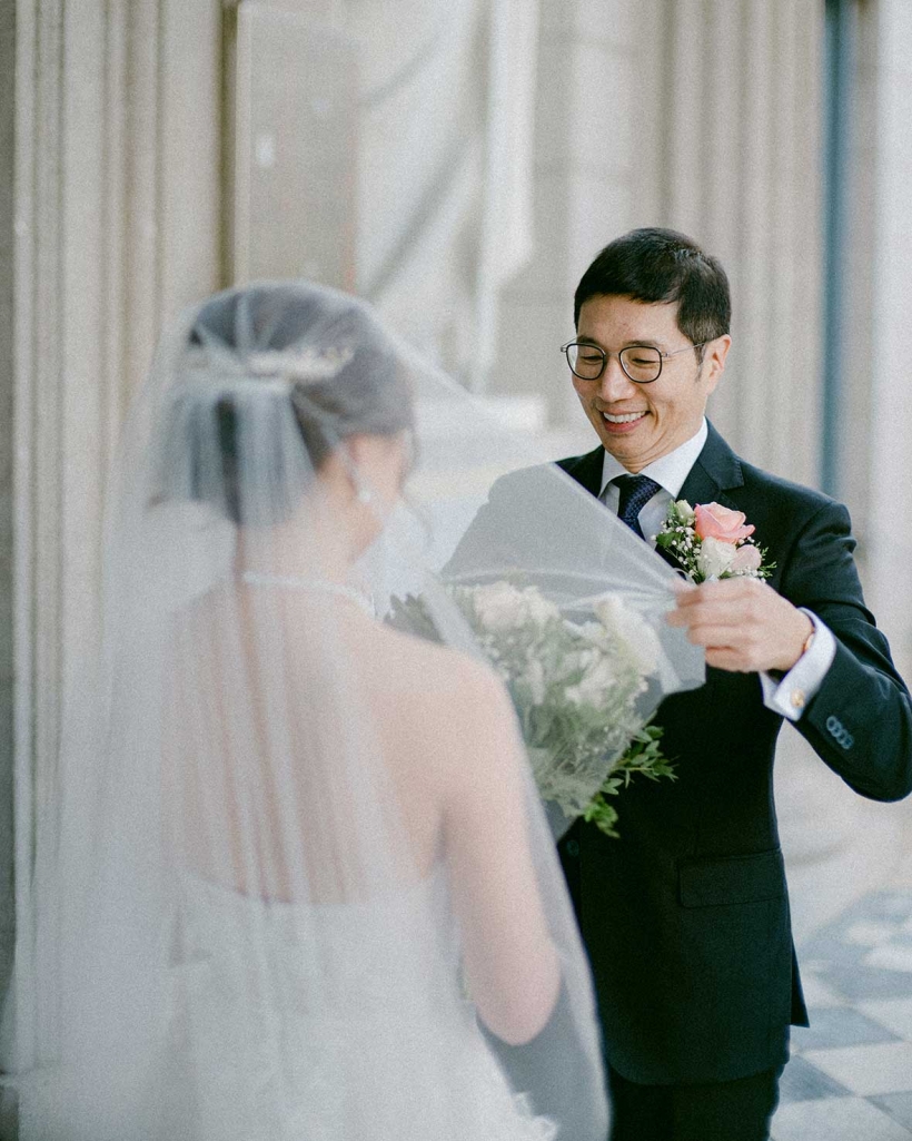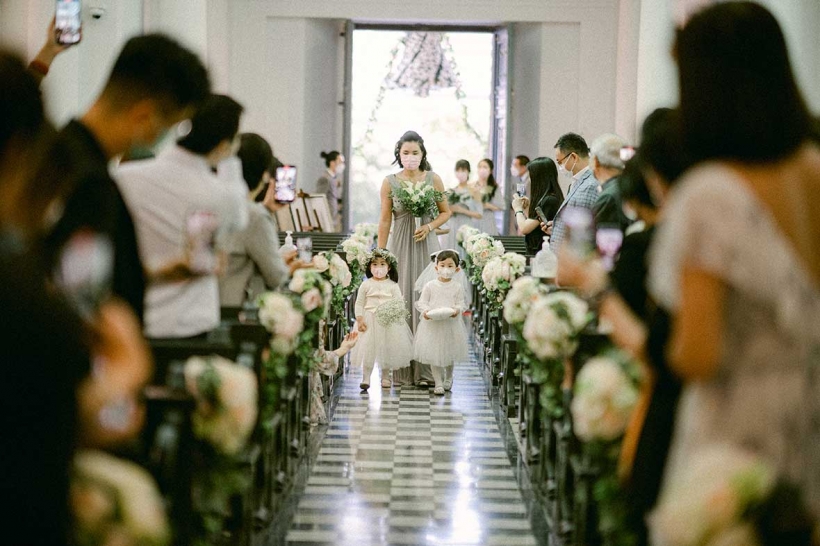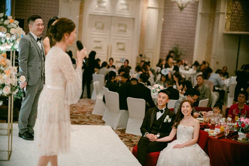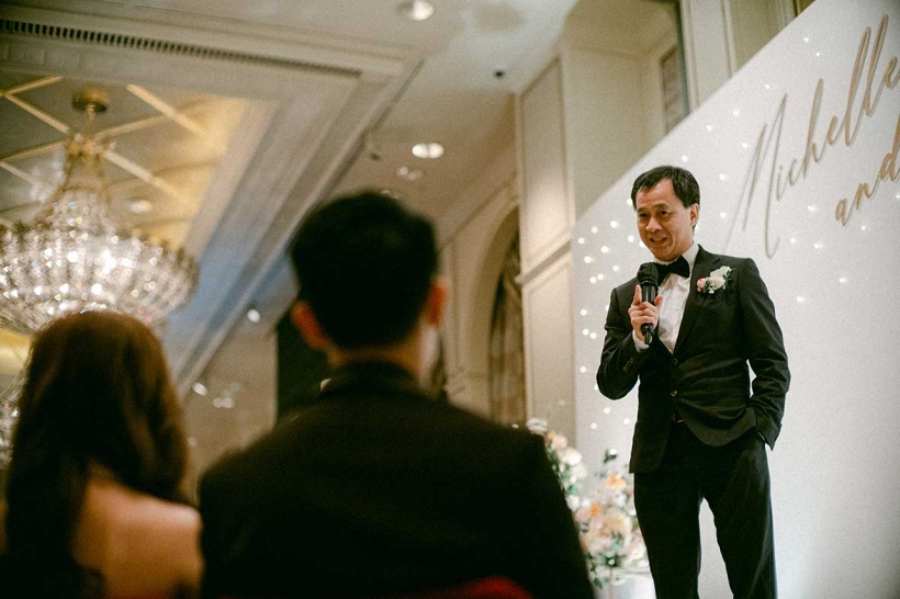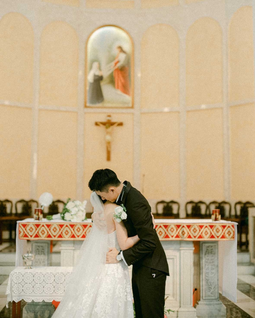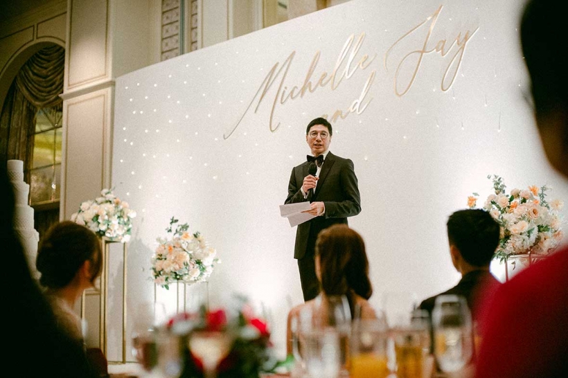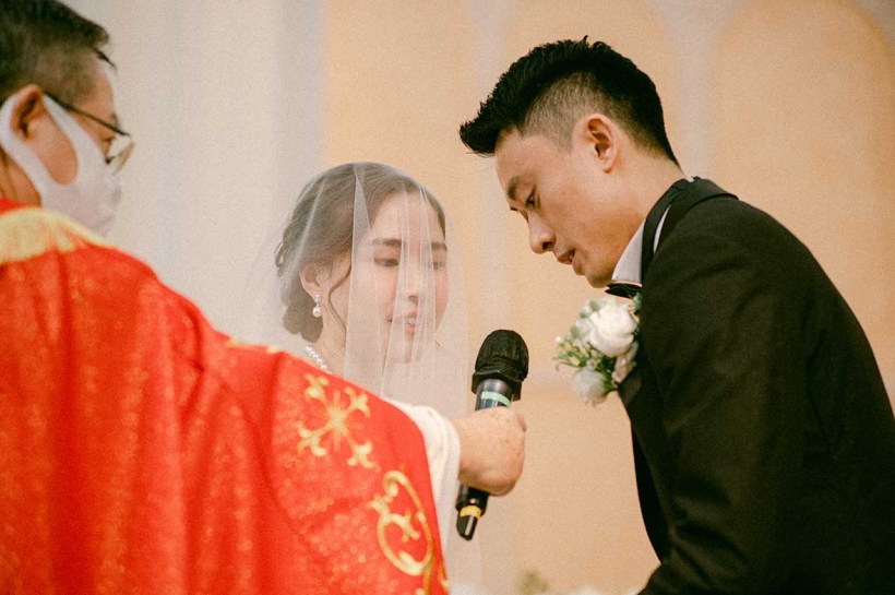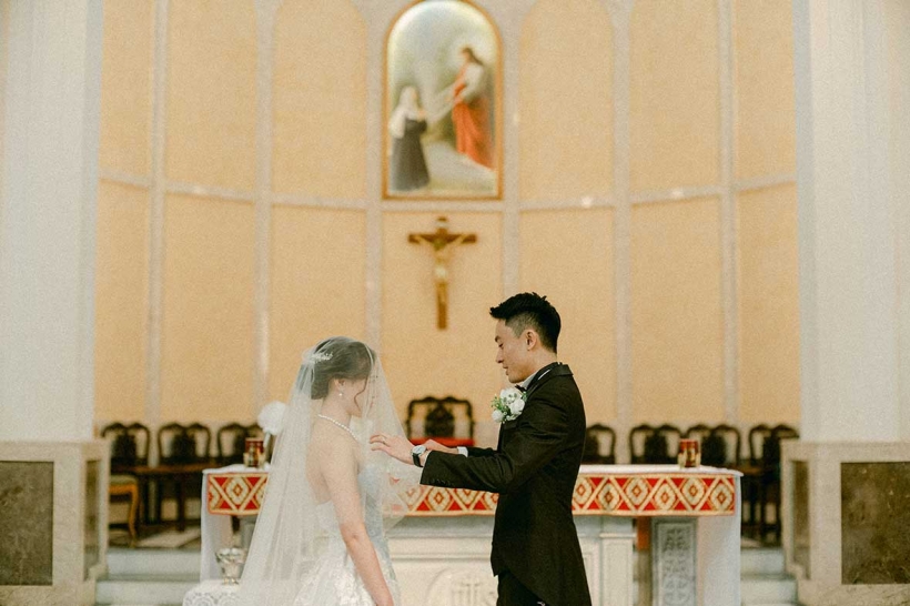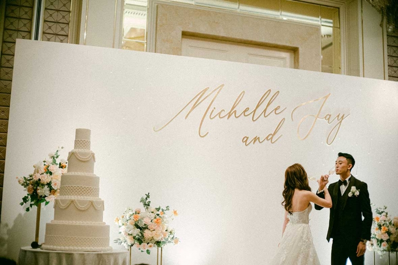 What I admire about St. Margaret’s Church as a wedding venue was the beautiful, ambient, warm lighting and the lovely pastel flowers pinned to the edge of each bench. In her long veil and elegant lace white dress, Michelle was accompanied by her father down the aisle to meet a well-dressed Jay, who was waiting before the large altar. Seeing the loving looks between the couple as they exchanged their vows, their family and friends were overcome with happiness for them.