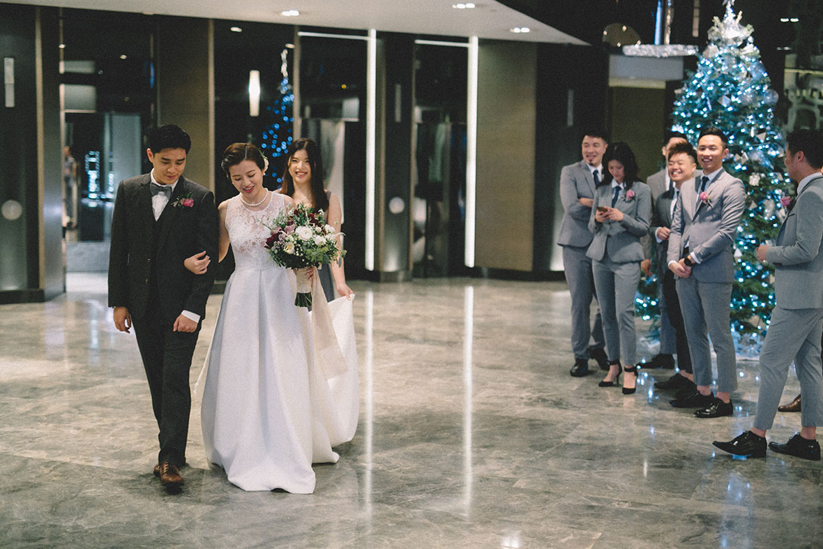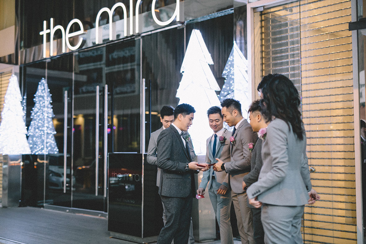 On a crisp December day, the groom and his groomsmen congregated outside The Mira Hotel, Hong Kong, framed with bright Christmas decorations. Brian was picking up Lorraine in her elegant white dress to Chinese Rhenish Church, Kowloon, where the wedding ceremony would be held. Walking through The Mira with her arm around Brian’s, you could tell that Lorraine and her husband-to-be had a great sense of comfort within each other’s company as they smiled and chatted to each other.